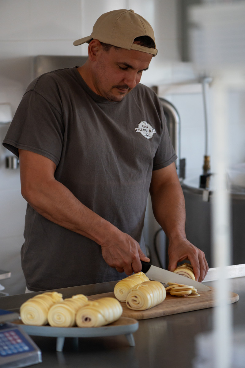 In a former press house on the Rezi vineyards, it's no longer wine aging, but cheese. Under the hands of Róbert Cserép, smoked parenyica, spiced gomolya cheese, and sweet whey cream are crafted daily. At dawn, while others are still sleeping, Robi is already in the cheese workshop: pasteurizing, curdling, stirring, shaping, smoking, packaging.