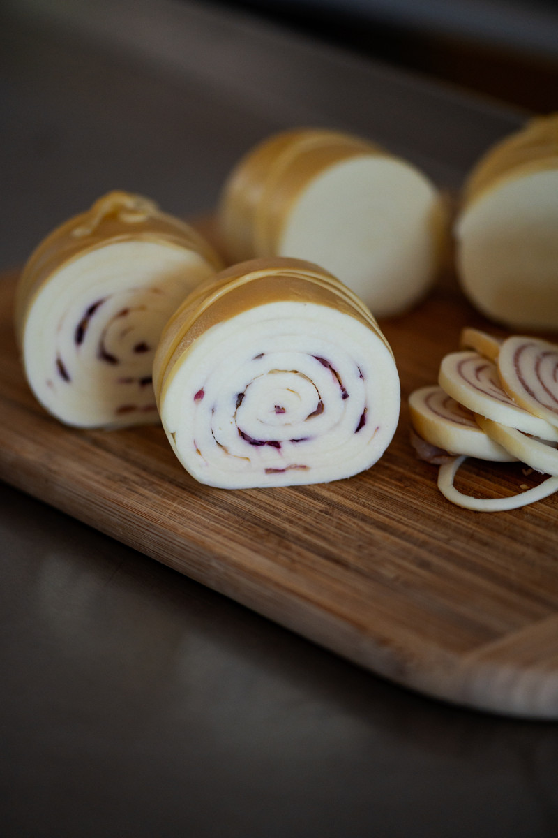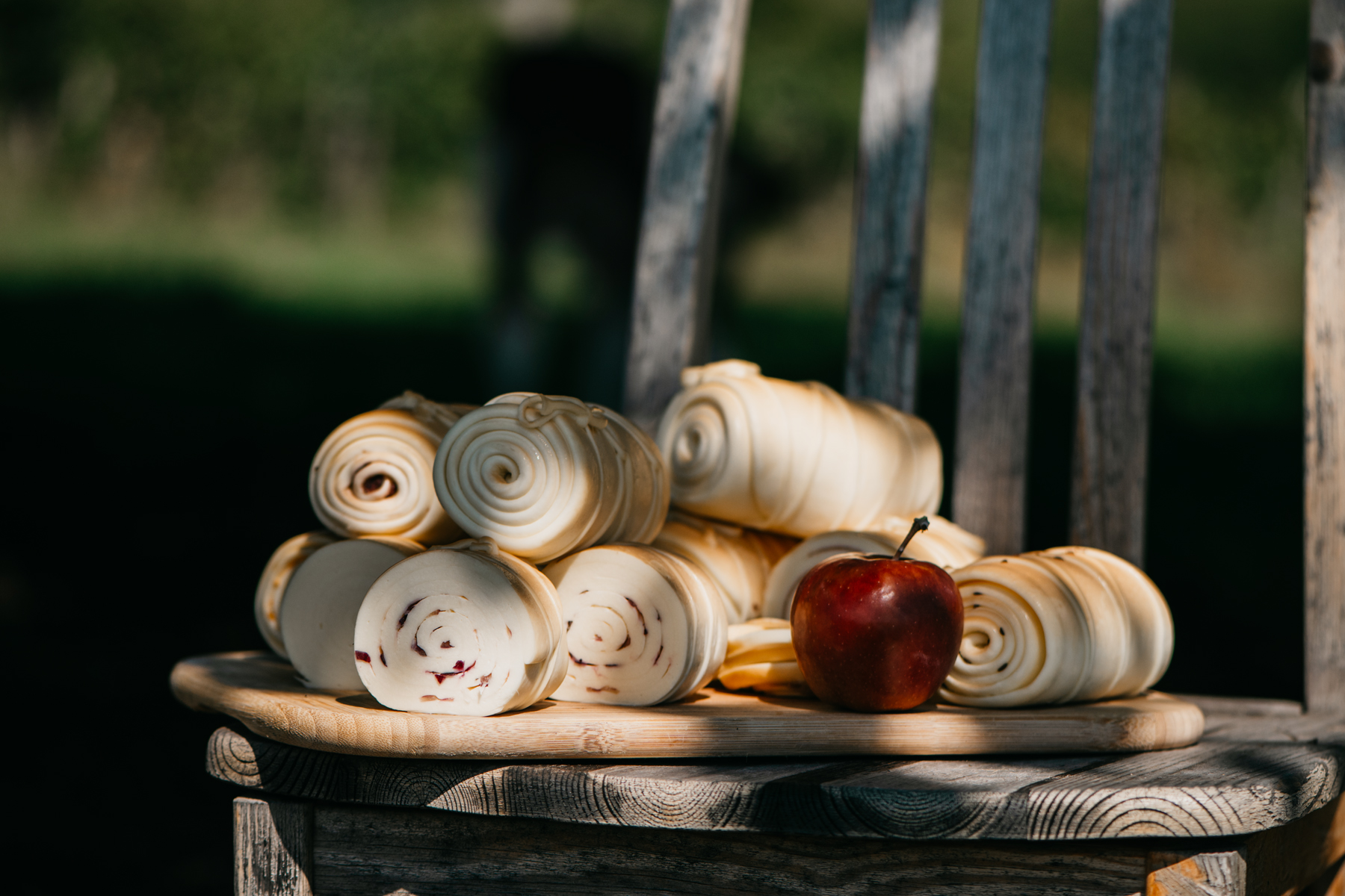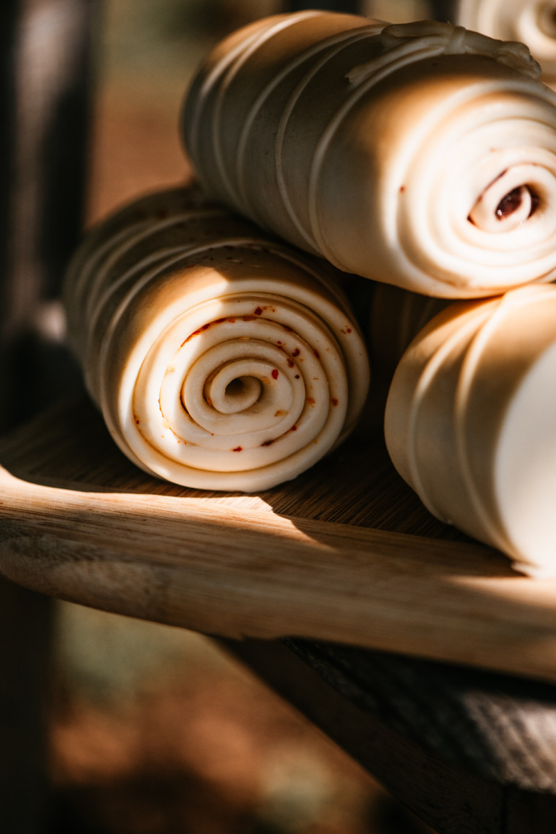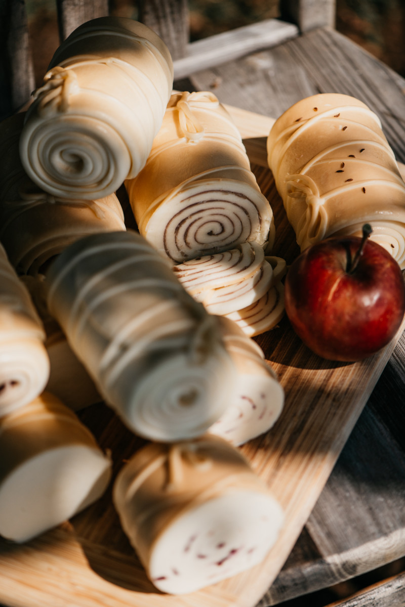 All cheeses are made from gently pasteurized milk, preserving their natural nutritional value. Robi carefully selects his rennet and bacterial cultures, using only natural, additive-free salt. Flavors are thoughtfully chosen: red onion, ham, garlic, wild garlic, sun-dried tomatoes, dried cranberries, chili — all-natural, often homegrown.