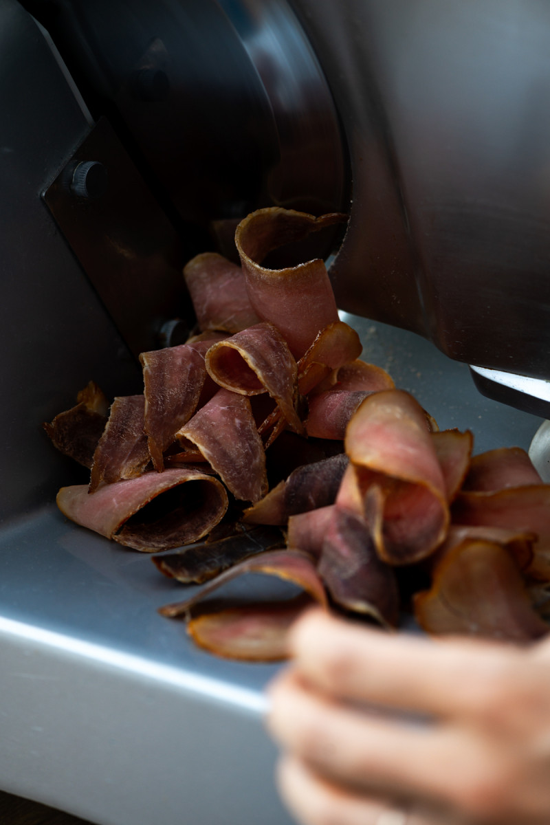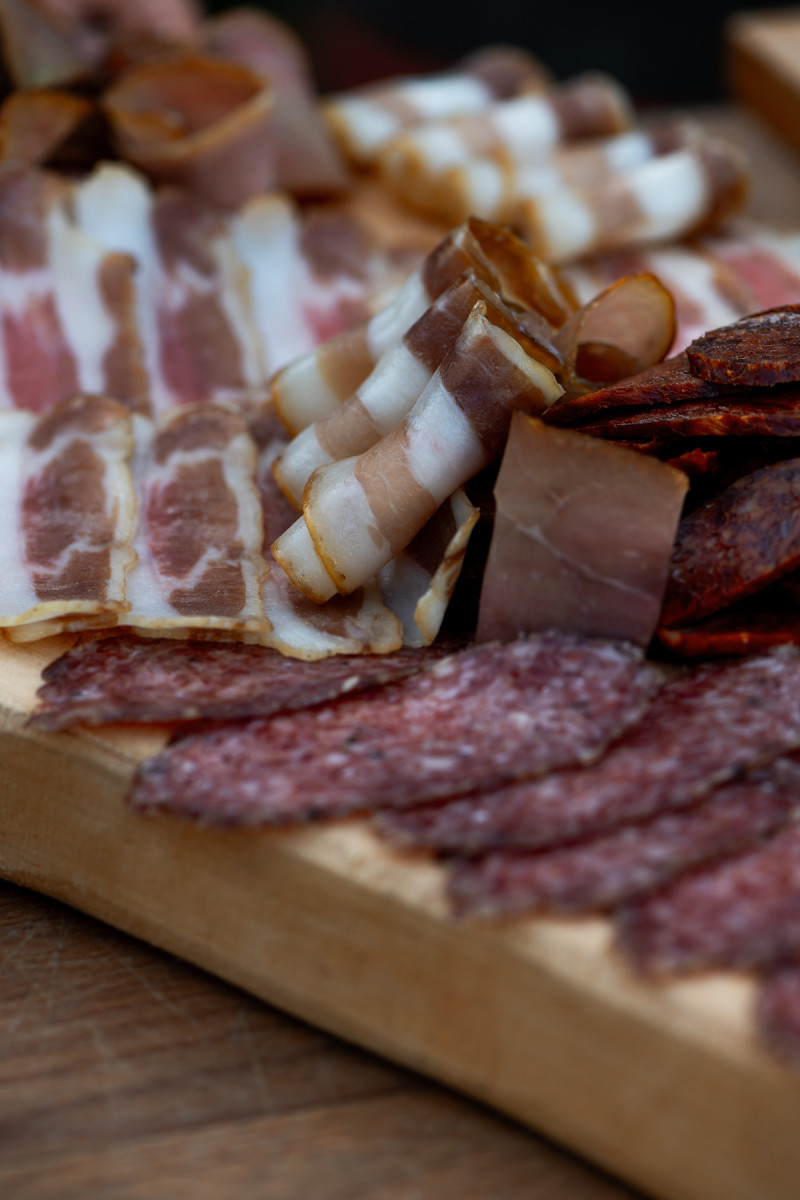 Hams are cured slowly, developing their distinct flavors and textures naturally—unlike industrial products where shortcuts are the norm. Seasonings are made from natural ingredients, often home-grown, such as paprika for their spicy salami and juniper berries for unique flavor profiles.