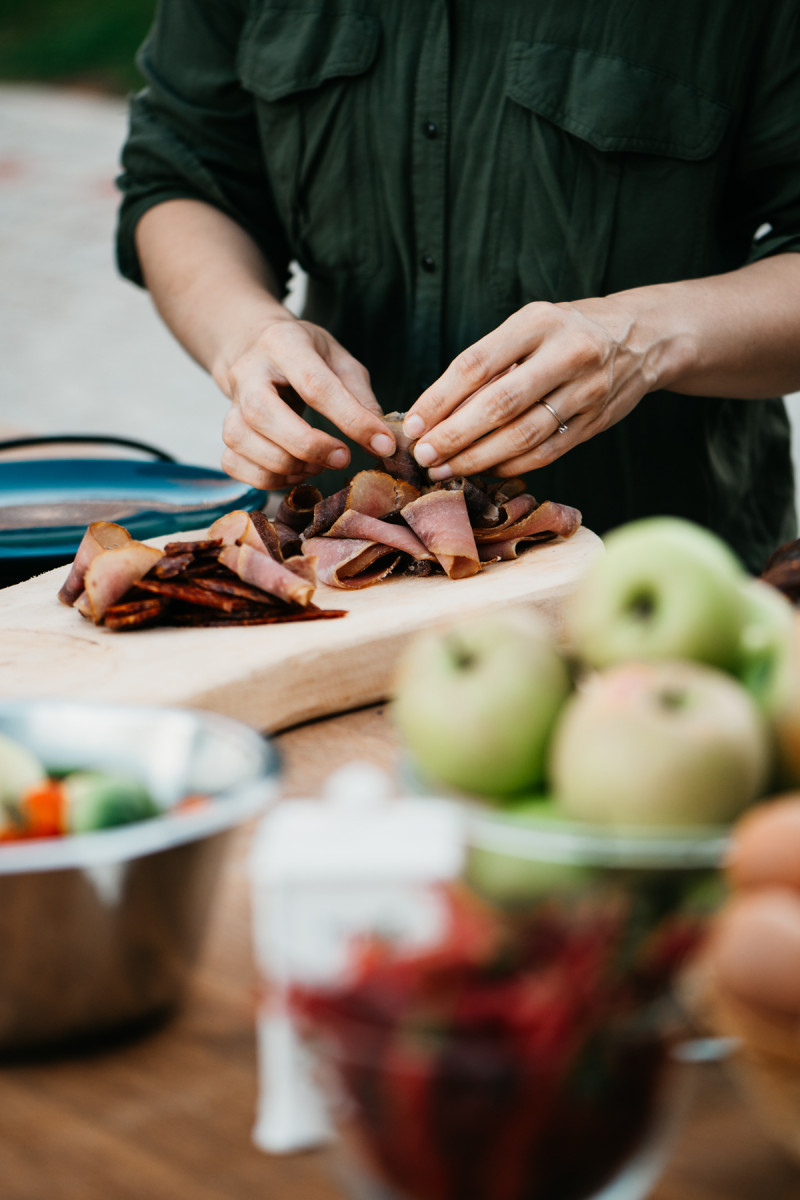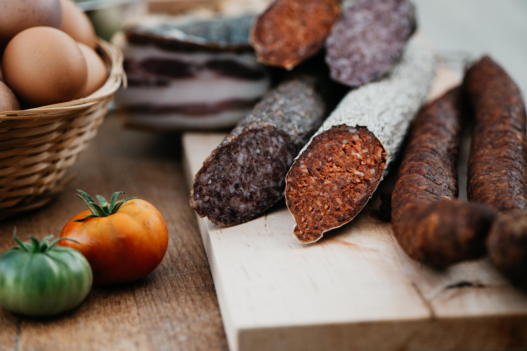 Their goal: to raise healthy, well-cared-for animals that provide high-quality meat for their handcrafted products. Butchering, cutting, curing, and smoking are all done by hand at their small-scale facility in Csáford.