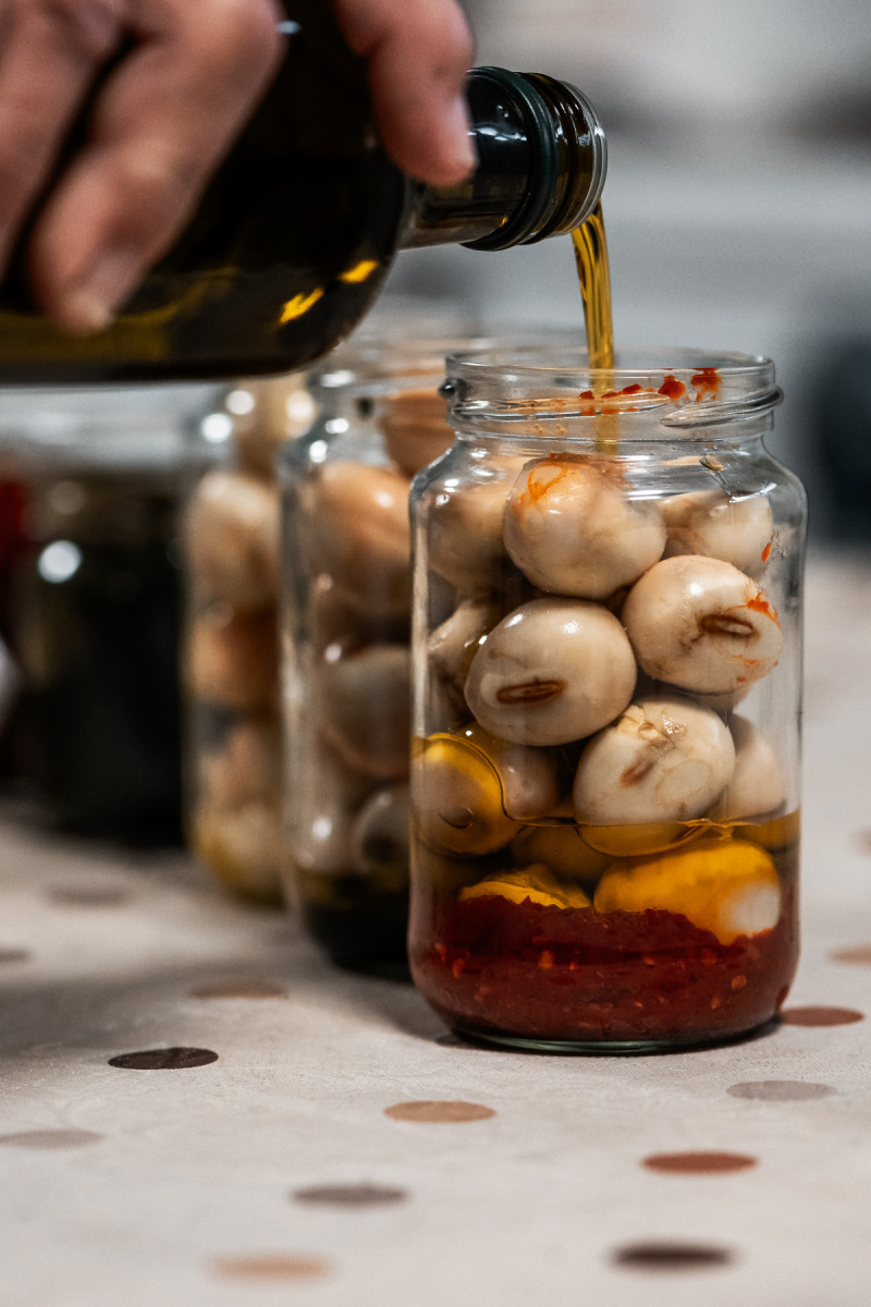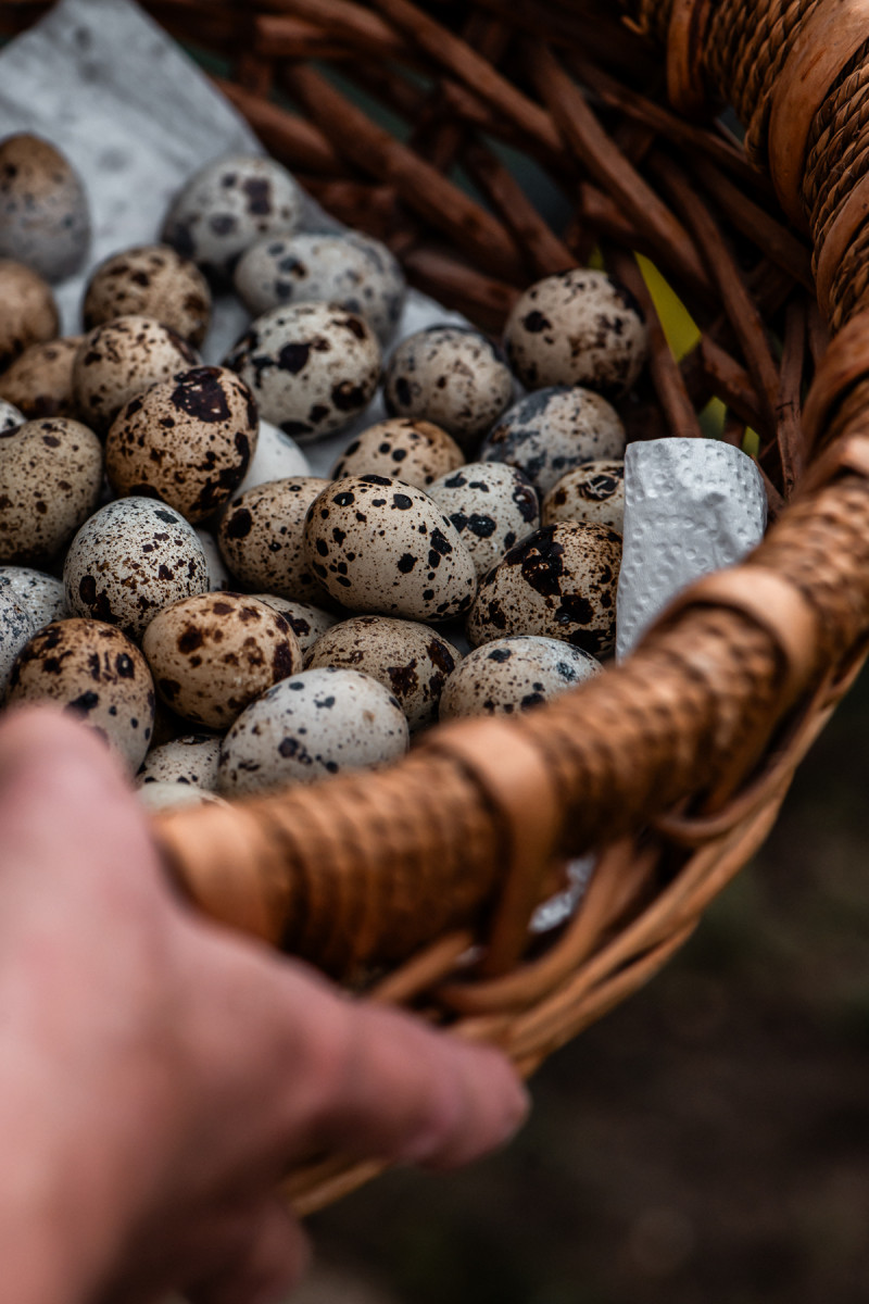 After boiling, the quail eggs are soaked in brine for several hours, then smoked over beechwood. The firm, white eggs are then preserved in olive oil with garlic, chili, wild garlic, or other seasonal herbs.