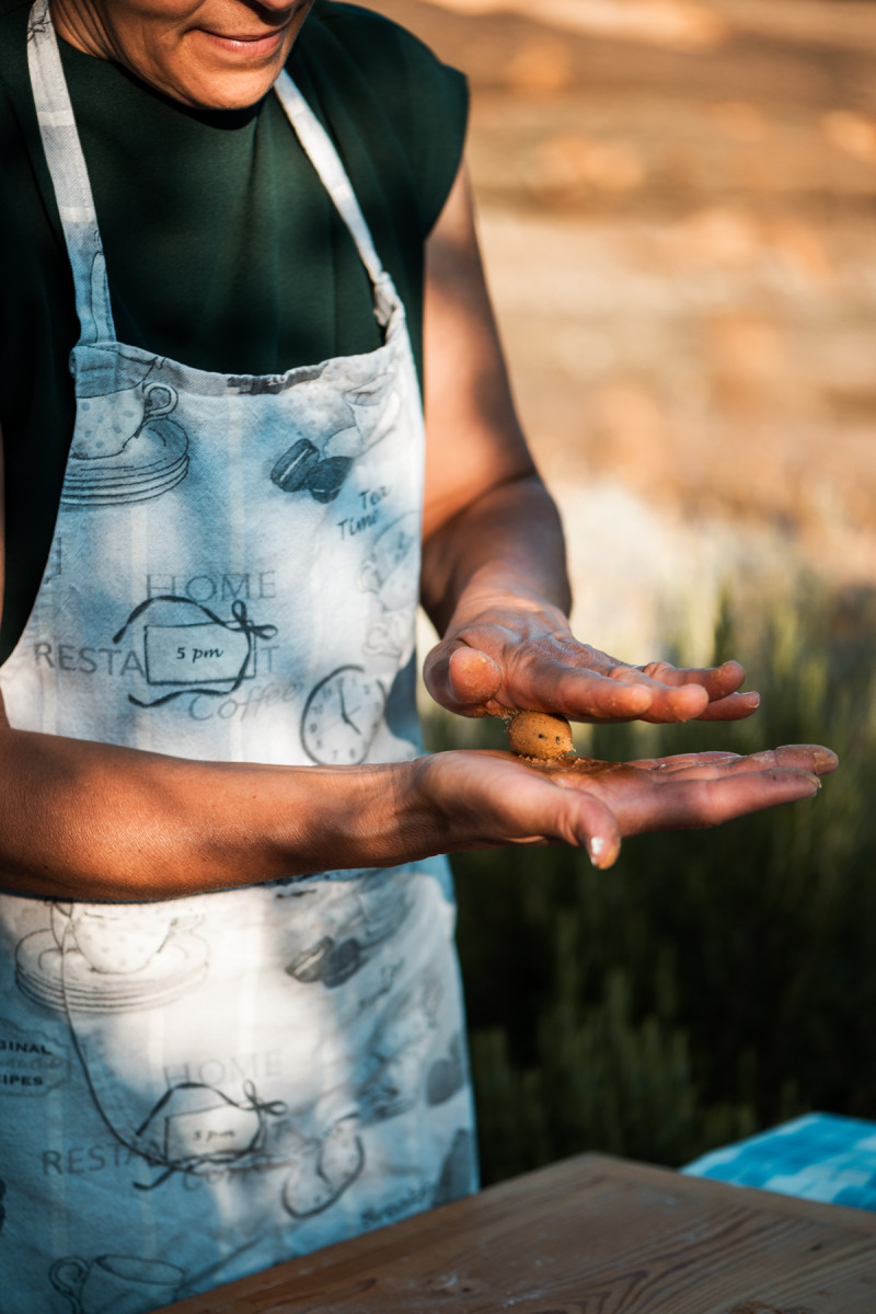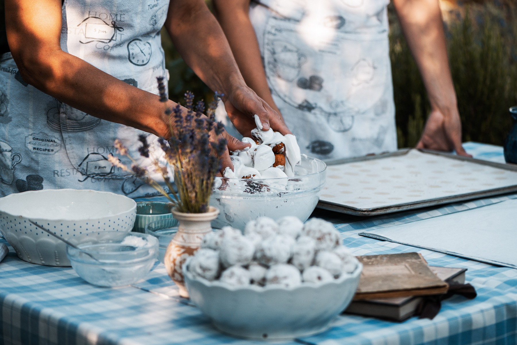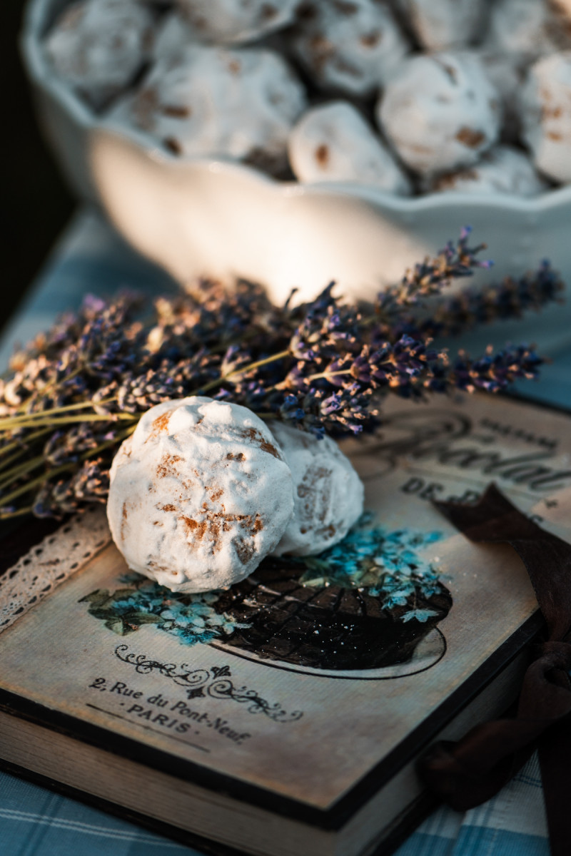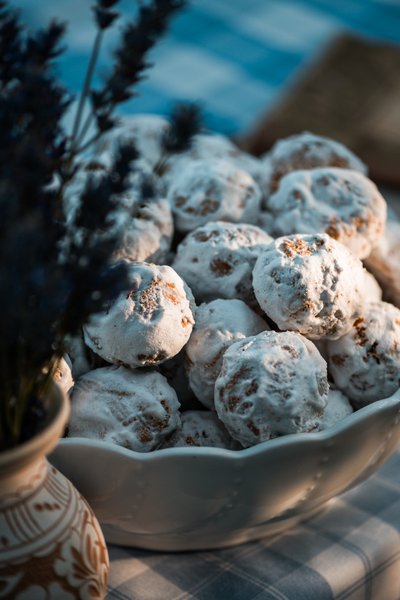 Each cookie is hand-rolled, placed individually on baking trays, and, after baking, dipped by hand into sugar glaze. They are then carefully lined up to dry — every piece crafted with care. Flavors include both classic and unique variations: plain, plum-rum, cranberry, candied orange, ginger (without glaze), cocoa with chocolate chips, and seasonal lavender. The lavender used in summer varieties blooms every June in the workshop’s garden.