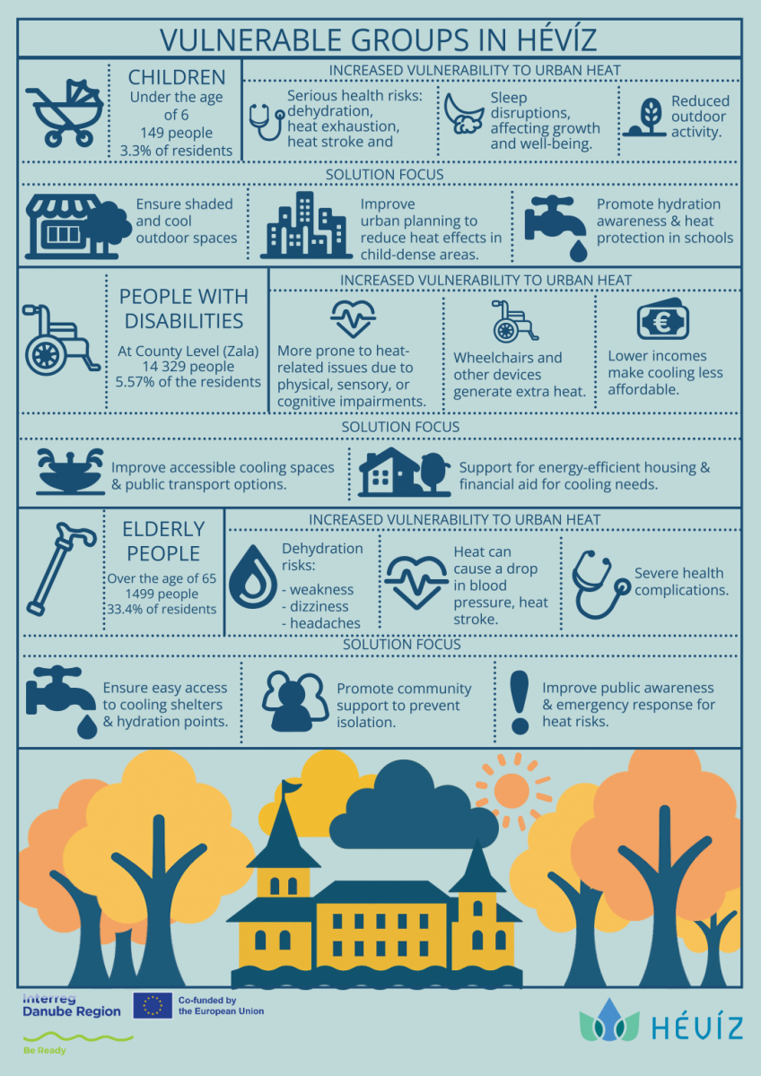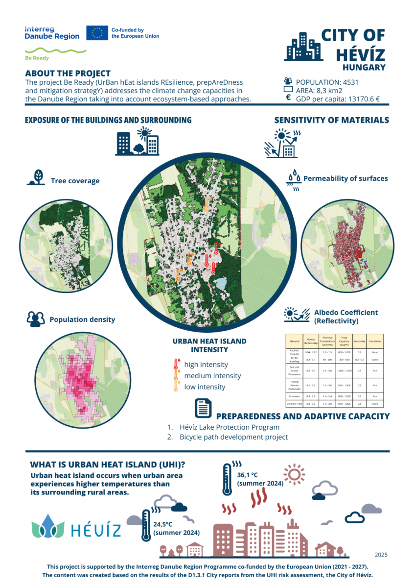 These materials are based on a local assessment of UHI-related risks in Hévíz and include essential information on the causes and effects of urban heat, risk groups within the population, and practical health protection advice during periods of extreme summer temperatures.