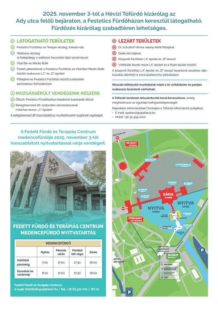 A Hévízi Tófürdő 2025. november 3-tól a téli időszakra vonatkozó változtatásokkal várja vendégeit. A fürdőzés ez idő alatt kizárólag szabadtéren lehetséges, a Tófürdő pedig csak az Ady utcai bejáraton, a Festetics Fürdőházon keresztül közelíthető meg.