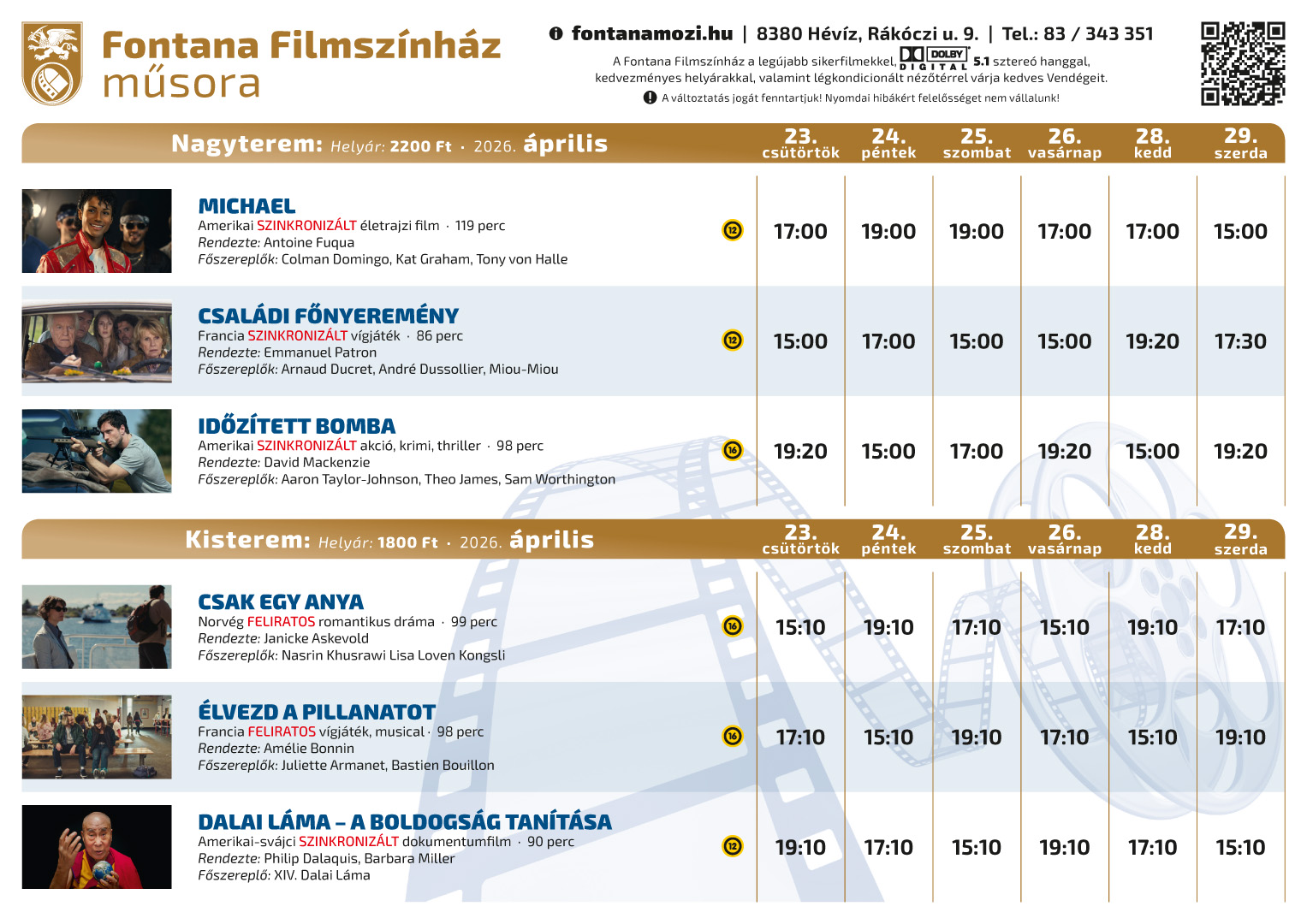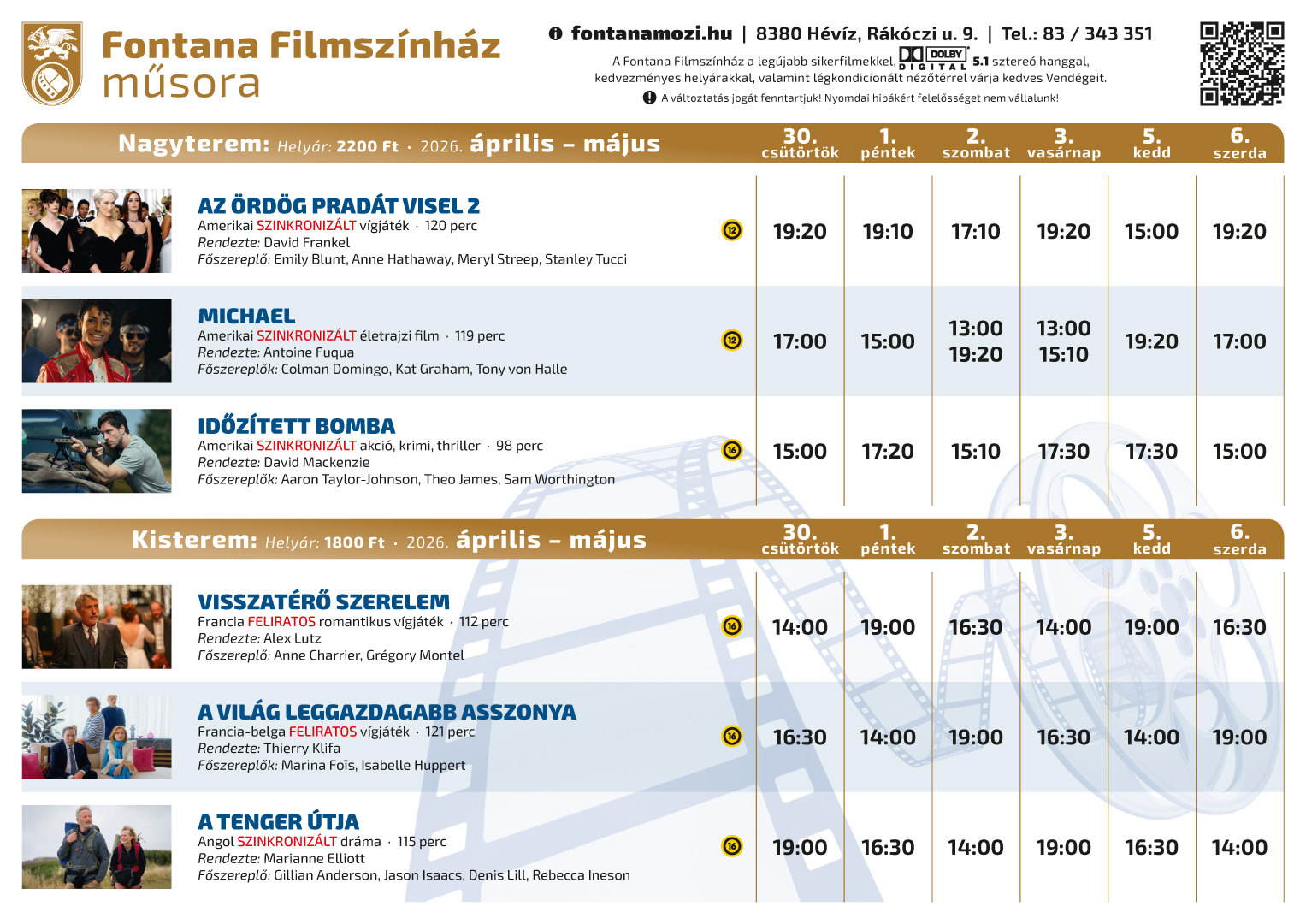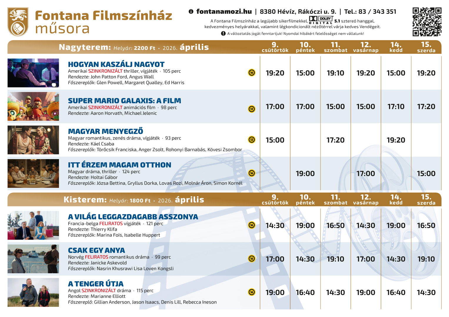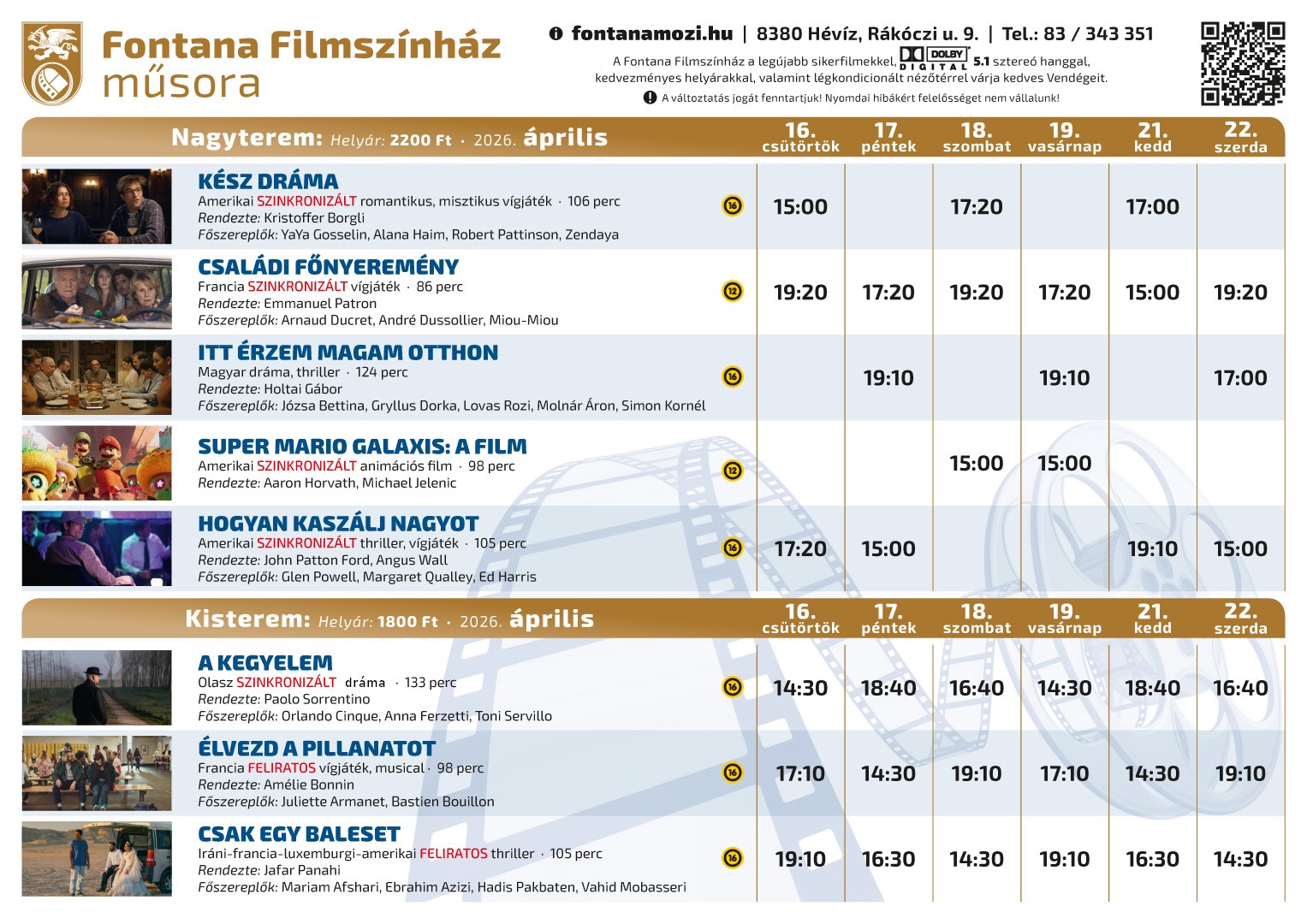 Információ: Fontana Filmszínház 8380 Hévíz, Rákóczi u.9. Tel: 83/343 351