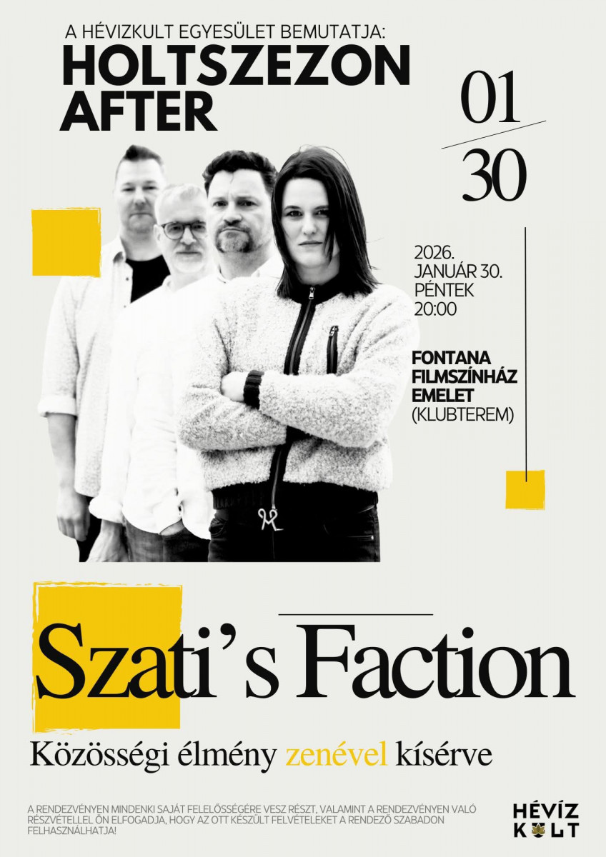 De a beszélgetés után az este még korántsem ér véget, hisz kezdetét veszi a HOLTSZEZON/AFTER, ahol a helyi zenészekből álló SZATI’S FACTION ad élő klubkoncertet!