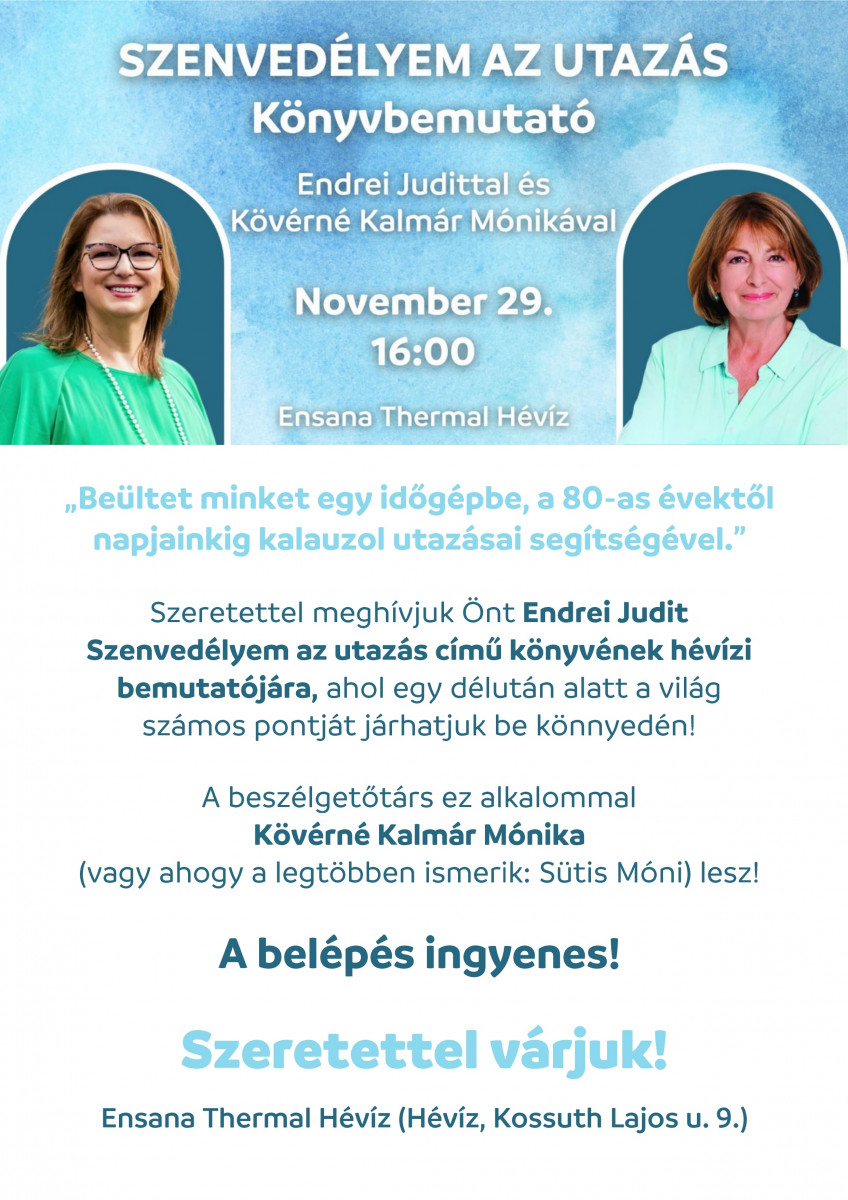 Hogyan fér el a világ egyetlen délutánba? Endrei Judit Szenvedélyem az utazás című könyvének hévízi bemutatóján minden kiderül. Egy kellemes, beszélgetős alkalom vár, ahol úti élmények, inspiráló gondolatok és személyes történetek kalauzolnak bennünket. Vendég: Kövérné Kalmár Mónika.