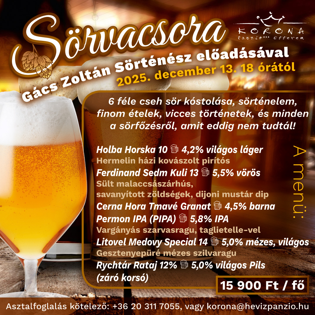 December 13-án egy igazán ínyenc program vár a Korona Étteremben: hatféle prémium cseh sör kóstolása, hozzájuk álmodott fogásokkal és Gács Zoltán sörtörténész izgalmas, humoros előadásával. A vendégek nemcsak a sörök világába nyerhetnek betekintést, hanem megismerhetik a főzés, az ízjegyek és a hagyományok titkait is – mindezt egy hangulatos, kulináris est keretében.