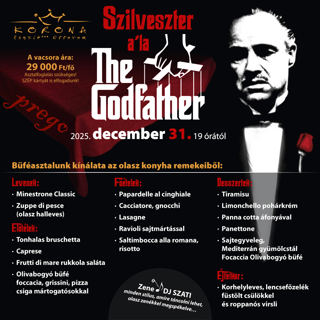 Lépj be az olasz életérzés és a filmklasszikusok világába december 31-én a Korona Étteremben! A „The Godfather” hangulatát idéző szilveszteri esten gazdag olasz büféasztal, mediterrán ízek, különleges fogások és a legfinomabb desszertek várnak. A zenéről DJ Szati gondoskodik – olasz dallamokkal fűszerezett tánczenékkel egészen éjfélig. Ha stílusosan, ízletesen és felejthetetlen hangulatban búcsúztatnád az évet, itt a helyed! A vendégeket éjfélkor hagyományos korhely- és lencsefőzelék is várja, hogy szerencsével induljon az új év.