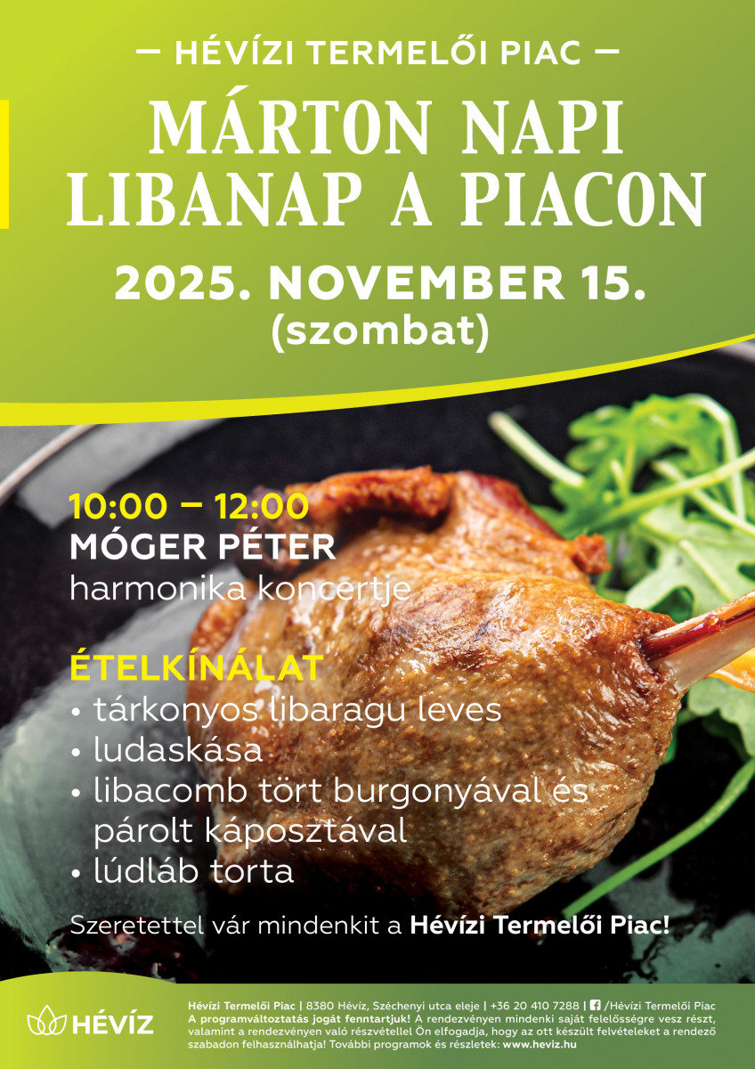 Az ősz egyik legízletesebb napja vár a Hévízi Termelői Piacon! A Márton-napi Libanapon a libás ételek, a forralt bor és a harmonikaszó egyaránt hozzájárulnak a felejthetetlen hétvégi hangulathoz.